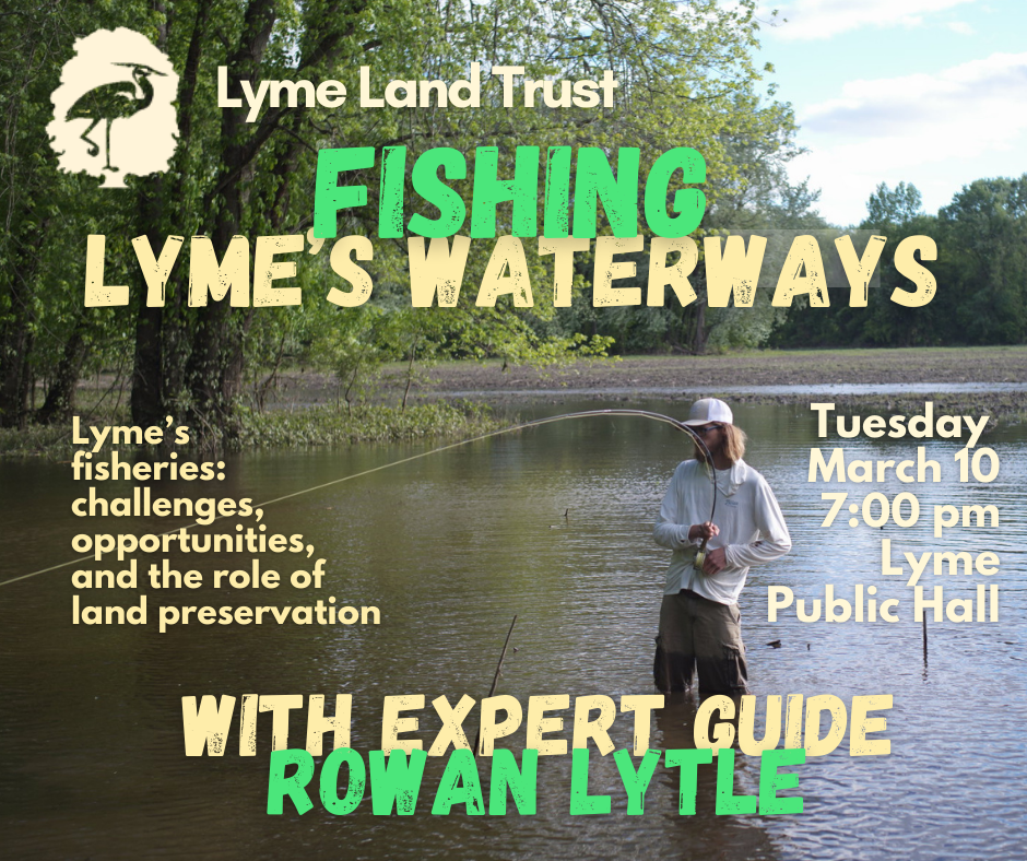 Are you a fishing enthusiast? Have you always wanted to be one? Or are you just interested in the fish that are likely to be lurking in the waterways you encounter while hiking the trails of Lyme? Either way, you’ll be interested to hear this Lyme Land Trust talk focusing on our local waterways.