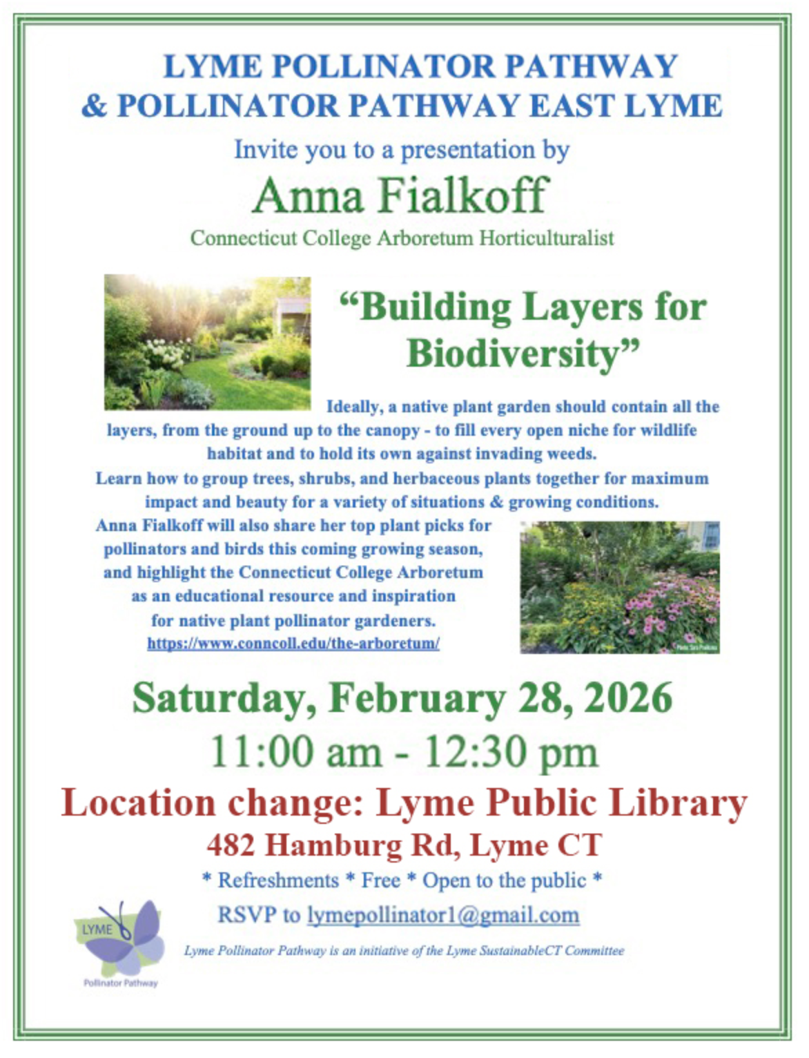The Lyme Pollinator Pathway invites you to join Jim Natale, native plant landscape expert, at the Lyme Public Hall for a presentation on what we can do to preserve our natural heritage. As he takes us on an exploration of our natural open space areas, he will discuss the threat of invasive plants and the rarely seen native plants that are at risk of local extinction. Jim will also talk about what homeowners can do on their own landscapes to help.